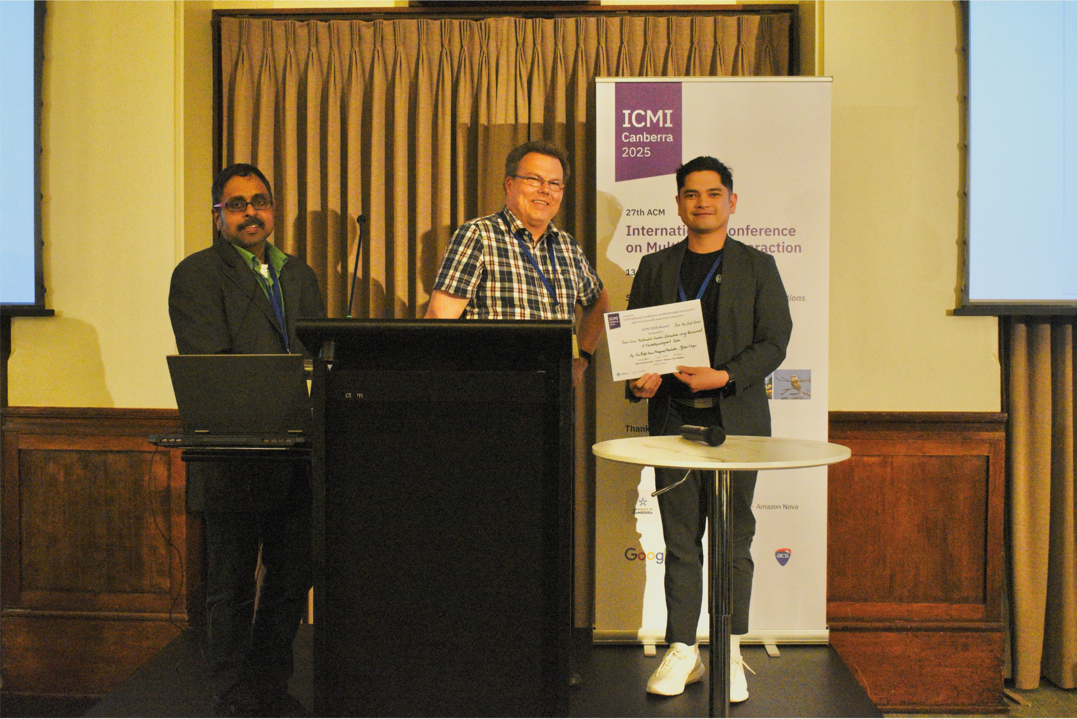 2025年10月13-17日に開催された The 27th International Conference on Multimodal Interaction で,エルブエラヴォンラルフディンマルケズ特任助教が発表した多感覚情動推定システムが Best Demo Award を受賞しました.運動信号と生理信号からリアルタイムに情動を推定することができます.